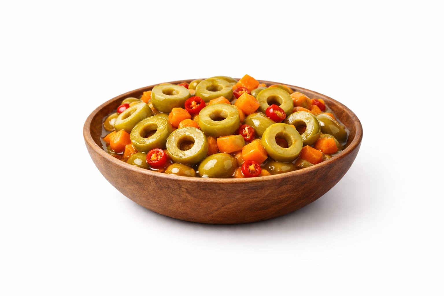 تتألق هذه السلطة الشهية في صحن خشبي مقعّر يعكس الطابع الطبيعي الأصيل، حيث تمتزج حبات الزيتون الأخضر الطازجة مع مكعبات الجزر المقرمشة ولمسات الشطة الحارة، مغمورة بزيت نباتي فاخر يمنحها لمعاناً جذاباً ونكهة غنية.